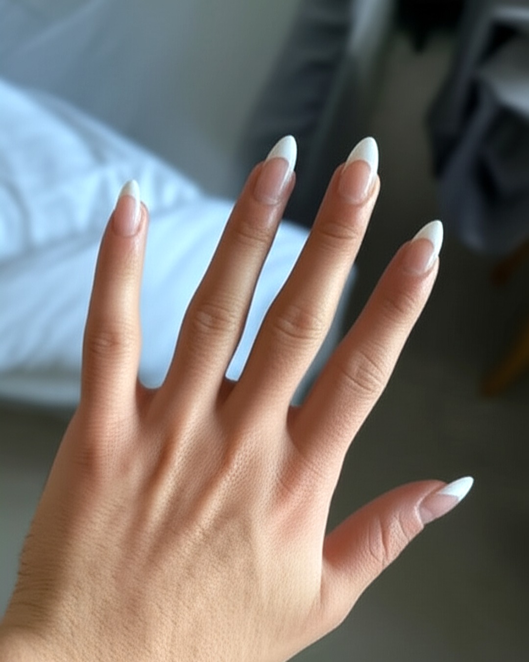 This white french tip manicure showcases the beauty of almond shaped nails at extra-long length. The natural base creates a perfect canvas for thewhite tips, while the glossy finish adds the perfect final touch.